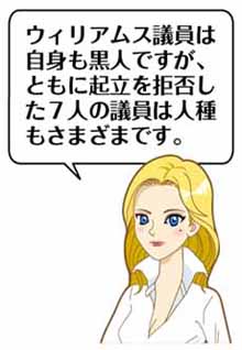ウィリアムス議員は、14日の出席時にも起立を拒否し、人種差別に関連した嫌がらせのメールを受け取ったという。同議員は、米フットボールチーム「サンフランシスコ49ers」のコリン・カーパーニック選手が、試合前の国歌斉唱の際に起立を拒否することで、米国での黒人差別に対する抗議の意図を示したことに感銘を受けたと述べた。同議員は、「国旗への忠誠の誓いでの起立を拒否しているからといって、国に反発しているわけではない。抗議する権利があることを称賛すべきだ」と語った。