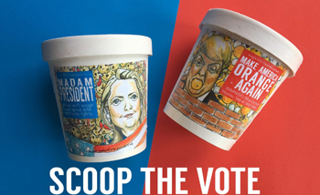 中でも注目を浴びているのは、ブルックリン区発の自然派アイスクリーム店「アンプル・ヒルズ」のヒラリー・クリントン氏(民主党)とドナルド・トランプ氏(共和党)にちなんだ商品。「女性大統領」と名付けられたアイスは、クリントン氏自身が考案したレシピを参考にした、チリペッパー風味のチョコレート味。一方、トランプ氏のスローガン「米国を再び偉大にしよう」を冷やかした言葉を商品名にした「米国を再び(オレンジのように)凸凹にしよう」は、同店が普段使用しない合成着色料を使ったオレンジ味で、トランプ氏が提案するメキシコとの国境沿いの壁に見立てたチョコレートブラウニーが入っている。どちらも店頭販売と、オンラインでのセット販売も行っている。