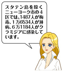全米で10万人につき305人がクラミジア、124人が淋病、23人が梅毒に感染しているというが、州では10万人につき390人がクラミジアに、130人が淋病に、40人が梅毒に感染している。