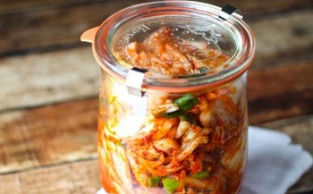 白菜やカリフラワー、キュウリを使ってキムチを作る料理教室。仕込んだキムチは広口瓶に入れて家で貯蔵。発酵食品の基礎知識やキムチの栄養価なども解説。