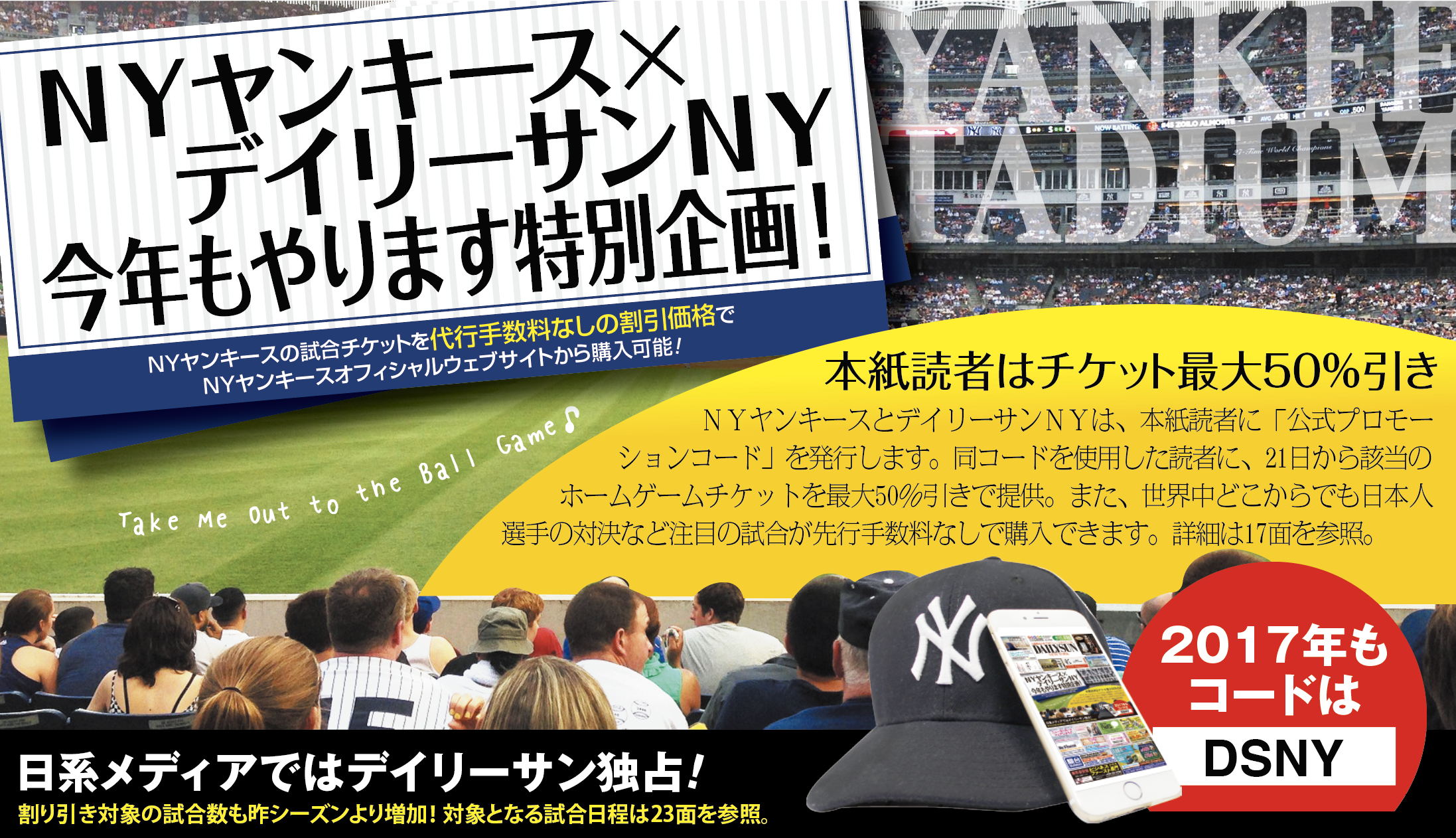 NYヤンキースとデイリーサンNYは、本紙読者に「公式プロモーションコード」を発行します。同コードを使用した読者に、21日から該当のホームゲームチケットを最大50%引きで提供。また、世界中どこからでも日本人選手の対決など注目の試合が先行手数料なしで購入できます。