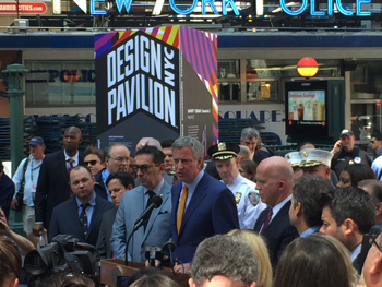 現場で記者会見を開き、事故の状況について説明するデブラシオ市長(photo: Yuka Takeuchi / 本紙)
