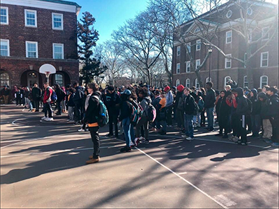 3月14日、教室から出てダグラス高校銃乱射事件の犠牲者を追悼するニューヨーク・ハーバー・ スクール・オブ・ガバナーズ・アイランドの生徒ら。同校では事件以降、ロックダウンが1回、シェルター・ イン・プレースが1回あった。いずれも匿名の銃撃予告が原因だという。写真は同校のツイッターより
