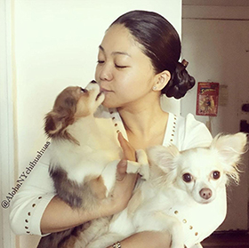 本コーナーのペット写真募集に投稿した並木洋子さんは、ポートレートなどの撮影と、ビンテージ雑貨、古着をリメイクした犬用の洋服を販売するオンラインショップ、トケズクローゼット(http://tokehscloset.wixsite.com/newyork)の代表。とけとまぶが着ている振袖はもちろん並木さんお手製です。今ではすっかり「モデル業」が板についた2匹との出会いから聞きました。