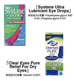 「目がしょぼしょぼする」「異物感がある」などと感じたときは、涙が蒸発あるいは出にくくなって乾いている可能性があります。ポリエチレングリコール(Polyethylene glycol)やプロピレングリコール(Propylene glycol)、グリセリン(Glycerin)などの人工涙液で十分に水分を補給しましょう。「Systane Ultra Lubricant Eye Drops」などがありますが、とろみのあるタイプは液体が目の外に流れ出るのを防ぎ、比較的長時間にわたって眼球の表面をコーティングしてくれます。さまざまな種類の人工涙液が販売されていますが、目的とする効果は同じです。人によって使用感が異なるので、好みに合わせて選ぶとよいでしょう。また、点眼は1回1滴で十分。点眼のポイントはまつ毛やまぶた、眼球に触れないようにすること。使用期限は開封後1カ月が目安です。