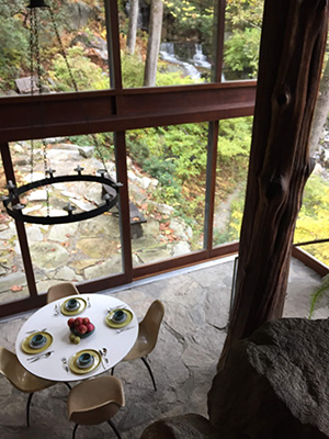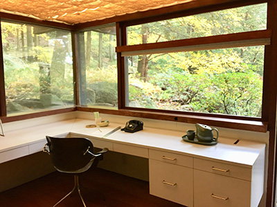 アメリカ先住民、アルゴンキン族の言葉で「偉大な魂が棲む地」という意味を持つラッセル・ライトの城、「マニトガ」が建つのは75エーカーにも及ぶ広大な土地。敷地内の木々や植物、滝や池まで、自然のあるがままの姿を生かし長い時間をかけて設計されたといいます。とりわけ素敵なのは、リビングとダイニングルーム。そしてその2つをつなぐ階段です。床や壁にはむき出しの岩を組み、屋内にいながらにして大自然の中でくつろいでいるような感覚を覚えます。「虫が見た風景」と表現されるアトリエは、3面をガラス窓で囲み緑を間近に感じさせるもの。月を眺められるテラスもあります。松葉を樹脂に貼り付けた天井、キャンバスを編んで作った間接照明など、素朴な工夫が随所に見られます。