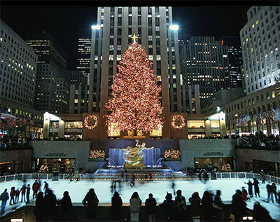 ロックフェラーセンターに設置された巨大クリスマスツリーの点灯式。点灯時間は午後9時。ラジオシティ・ミュージックホールのロケッツや著名人が出演する式の様子はNBCテレビで放送。
