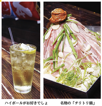 みんなでワイワイやるならパリッとキマッた“ハイボール”片手に名物「チリトリ鍋」で! 木~土曜の午後11時~翌午前4時のハッピーアワーは焼酎と日本酒のボトル(対象外の商品あり)が半額に。お値打ちに冬を越そう。