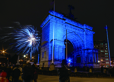 アーチの下でクリスマスキャロルを楽しむ、90年以上続くイベント。吹奏楽団の演奏に合わせておなじみの曲を一緒に歌おう。展示ツリーは約14メートル。