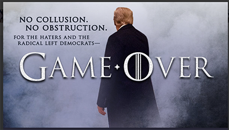 トランプ氏が投稿した画像は、今月14日に最終シーズンの放送が始まったHBOの人気ドラマシリーズ「ゲーム・オブ・スローンズ」風に、ロシア疑惑捜査を進めた民主党をやゆしたもの。