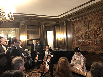 続いて、箏・三味線奏者の木村伶香能さんとチェロ奏者の玉木光さんによる二重奏ユニット、デュオ夢乃が古典と現代曲を披露した。招待客は、大使公邸料理長の嶋泰宏さん、副料理長の堤昭吾さんによる日本料理と日本各地の名酒を堪能、マグロ解体ショーも楽しんだ。
