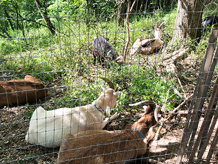 ヤギはニューヨーク州北部ダッチェス郡レインバックの農場から。リバーサイドパークには、ツタ、ノブドウ、ヒメリュウキンカ、野バラ、ワインベリー、ズルカマラなどヤギの「好物」が数多く自生している。22日、平日にもかかわらず見物する人でにぎわった=リバーサイドパーク120丁目で撮影 (photo: Asami Kato / 本紙)