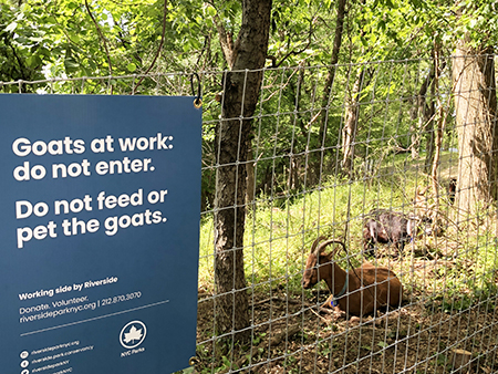 マンハッタン区アッパーウエストサイドのリバーサイドパークに21日、ヤギ24頭がやって来た。任務は雑草の駆除。8月30日までの約3カ月間、同パーク北部の柵で囲われた2エーカーの傾斜地で雑草を食べ続ける。同パークによると、ヤギは雑草を根まで食べ尽くすため、完璧な除草ができるという。傾斜地は人や機械での除草作業が難しいため、ヤギを雇って経費削減。もちろん、エコな方法で森林保全ができるのも利点だ。