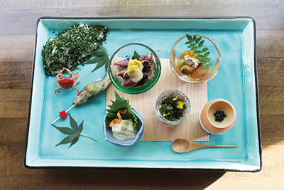 水色の角皿が目にも涼やかな八寸=写真上=は、稚鮎の天ぷら木の芽ソース添え、生湯葉の刺身、ホタルイカの酢味噌和え、サワガニの素揚げ、海ぶどうのサラダ、トリュフの茶碗蒸し、エビと穴子の煮こごりの盛り合わせ。