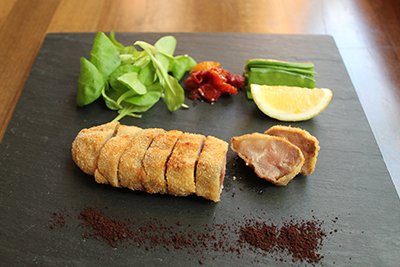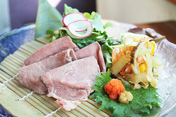 ドングリを食べて育つことから特有の香りと家禽類のような食感のイベリコ豚はカツ仕立てで=写真中。キャベツではなくマーシュと絹さや、サンドライドアプリコットを付け合わせに、八丁味噌パウダーを添えている。褐色のパウダーは奥田さんの考案。豆腐もイカの塩辛もギョーザも全て手作りでないと気が済まないから、仕込みには人一倍時間をかけるという。「6月は鮎と空豆が旬。お客さんの喜ぶ顔を想像しながら、何を作ろうか考えるのが楽しい」と顔をほころばせた。
