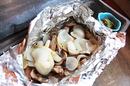 北海道産のユリ根とキノコのバター焼き。口直しに添えてあるのはペンシルベニア州で採れた山菜、板ドリ