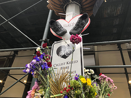 マンハッタン区6番街で6月24日、トラックにひかれて死亡したサイクリストを追悼する記念碑(photo: Asami Kato / 本紙)