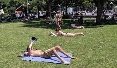 ワシントン・スクエア・パークでは芝生で日光浴する人も=19日午後撮影(photo: Yurika Fukagawa / 本紙)