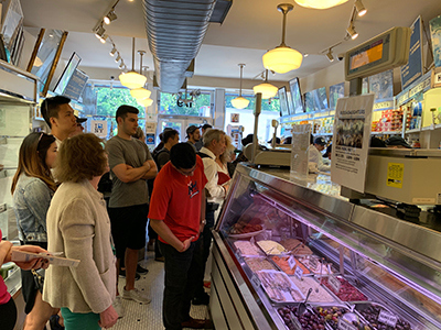 いつ行っても満員の人気店でガラスケースの中にはサーモンやスタージョンなど薫製魚だけでも10種類近くが並ぶ。注文を受けた職人たちが紙のような薄さでそれらを切りさばく姿をカウンター越しに眺めていると生唾が出る。