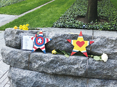 9/11メモリアルプラザの一角、メモリアルグレードに供えられた花やメッセージ=今年5月撮影(photo: Asami Kato / 本紙)
