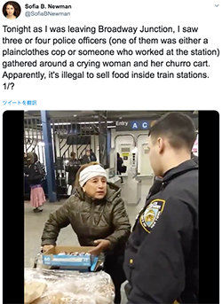 8日、地下鉄構内でチュロスを販売していた女性を、ニューヨーク市警察が取り囲み、連行する様子を写した動画がSNSで拡散。何百人もが「チュロレディ」についてツイートし、騒ぎに発展している。ニューヨークタイムズが13日、報じた。その後の調べから、女性はブルックリン区在住のエクアドル移民(43)で、3年にわたり無免許でチュロスを販売していたことが分かった。