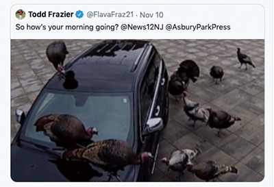 トムズリバーの広報担当によると、病気やけがをしない限り、動物管理官が野生の七面鳥を保護するのは違法。13日、ニュージャージー州の魚類野生生物局は七面鳥にトウモロコシを与え、網で捕まえて移動させる作業を開始した。