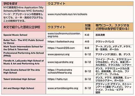 Admission Guideおよびオンラインディレクトリーで各地の多様なアート系のプログラムを見つけられる(上の表を参照)。ここで知っておくべきことは、アート系に限らず、一般的に中学・高校は実質的に各学校が提供するプログラムへの進学ということだ。例えば1つの学校にアート系プログラムと一般教育のプログラムがある場合、希望すればその両方に申し込むことができる。ただし、入学後のプログラム変更はできない。ほぼ全ての公立中学およびプログラムは、学校別のオーディションの有無に限らず1つのアプリケーションフォームに希望する学校やプログラムを12校選んで申し込むが、以下の2校のみ特別なオーディション過程がある(詳細はMiddle School Guideおよび各校のウエブサイトで確認)。