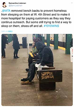 MTAは、ホームレスが横になって眠れないようにひじ掛けを設置。しかし、後ろの背もたれに寄り掛かり眠るホームレスが後を絶えず、寝泊りの阻止にはつながらなかった。業を煮やしたMTAは先月、十数個あったベンチの背もたれを「撤去」する強行策に出た。