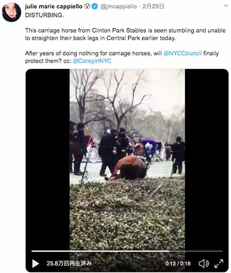 マンハッタン区セントラルパークで観光用馬車を引く馬が、もがき苦しんだ末に地面に倒れる様子を映した動画がツイッターで拡散。デブラシオ市長が市長選の公約の1つに掲げていたにもかかわらず、市議会の賛成が得られずに頓挫した馬車廃止を求める声が再び高まっている。ニューヨークタイムズが2日、報じた。