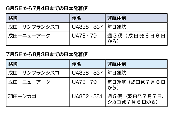 フライトスケジュールは今後、検疫体制や出入国管理の変更などにより、変動する可能性がある。最新情報はユナイテッド航空のウェブサイト(https://www.united.com/en/us)を参照すること。