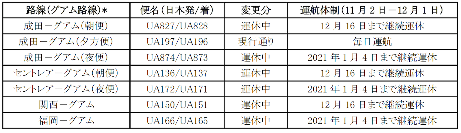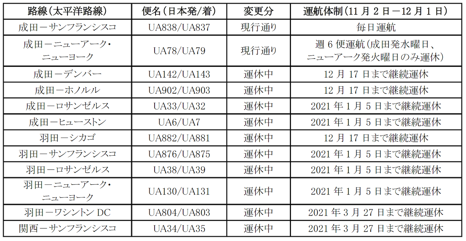 なお、一部の現行運休路線については、現在の需要動向を鑑み、引き続き12月16日、12月17日、2021年1月4日、1月5日、もしくは3月27日まで(全て日本発ベース)の運休を決定した。