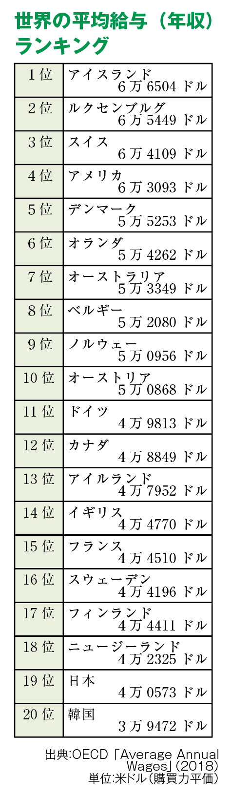 次に示すように、日本人の平均給与は、購買力平価(PPP)によるランキング(2018年)で、19位4万573ドルである。アメリカの4位6万3093ドル、ドイツの11位4万9813ドル、イギリスの14位4万4770ドルなどに比べると、かなりの差がある。しかも、OECD35カ国(2018年当時、2020年現在では加盟国は37カ国)の平均4万6686ドルを下回っているのだ。