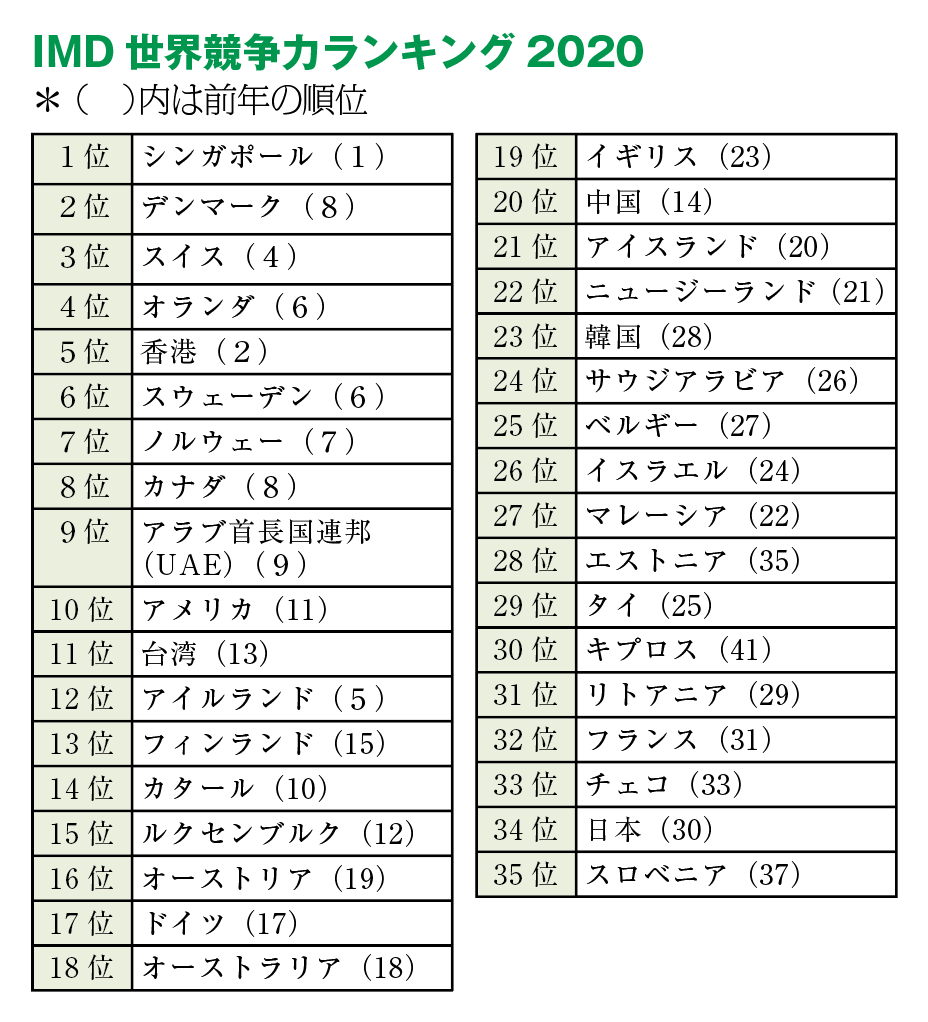 コロナ禍の最中、2020年6月に、毎年恒例のスイスのビジネススクール「IMD」(International Institute for Management Development)による「世界競争力ランキング」 が発表された。