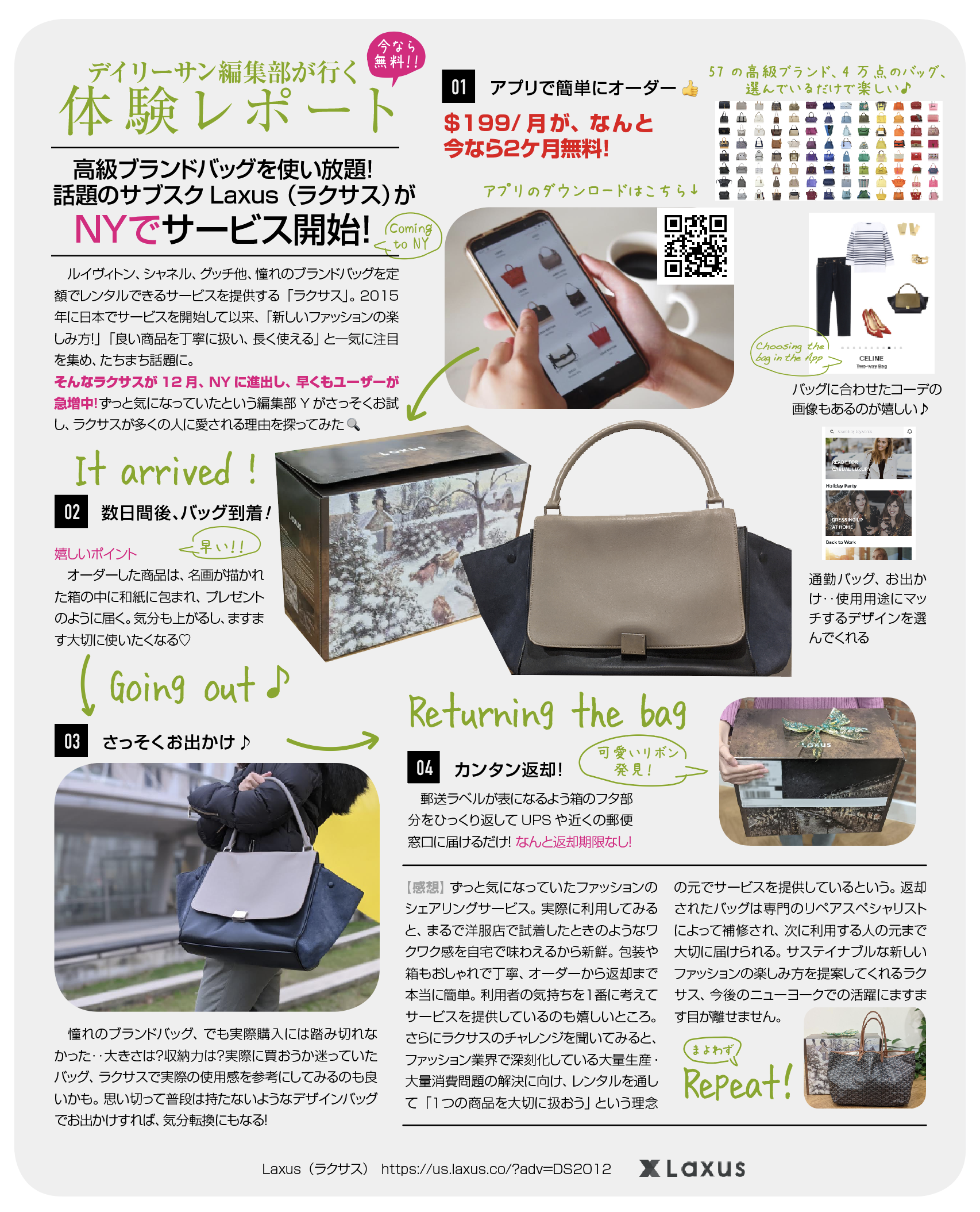 【感想】ずっと気になっていたファッションのシェアリングサービス。実際に利用してみると、まるで洋服店で試着したときのようなワクワク感を自宅で味わえるから新鮮。包装や箱もおしゃれで丁寧、オーダーから返却まで本当に簡単。利用者の気持ちを1番に考えてサービスを提供しているのも嬉しいところ。さらにラクサスのチャレンジを聞いてみると、ファッション業界で深刻化している大量生産・大量消費問題の解決に向け、レンタルを通して「1つの商品を大切に扱おう」という理念の元でサービスを提供しているという。返却されたバッグは専門のリペアスペシャリストによって補修され、次に利用する人の元まで大切に届けられる。サステイナブルな新しいファッションの楽しみ方を提案してくれるラクサス、今後のニューヨークでの活躍にますます目が離せません。