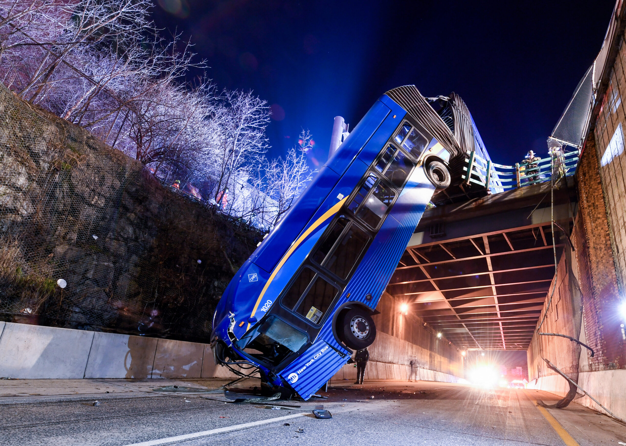 ブロンクス区で14日午後11時ごろ、高架道路を走行していたニューヨーク州都市交通局(MTA)の連節バスが、スピードの出しすぎにより前方車両が50フィート(約15メートル)下の高速道路に落下。乗客や運転手の8人が負傷し病院に搬送された。各メディアが同日、報じた。 バスは同区ユニバーシティーアベニューからランプに左折しようとしたところ、前方がガードレールを突き破り、クロスブロンクス高速道路に落下。事故直後、運転手の呼気から基準値以上のアルコールは検出されなかったものの、その後の連邦政府により義務付けられた検査を拒否しているという。また、バスは規定を上回る時速17〜26マイルで走行していたことが発覚。現在より詳しい捜査を進めている。
