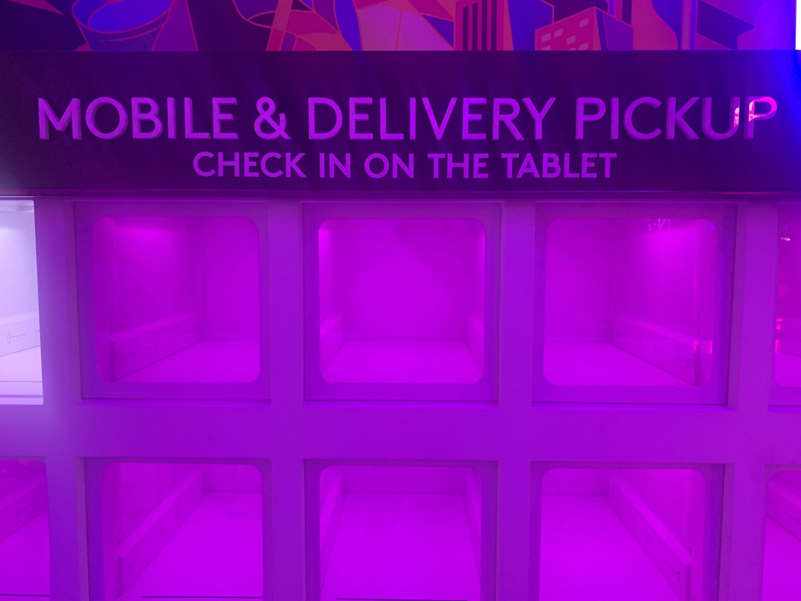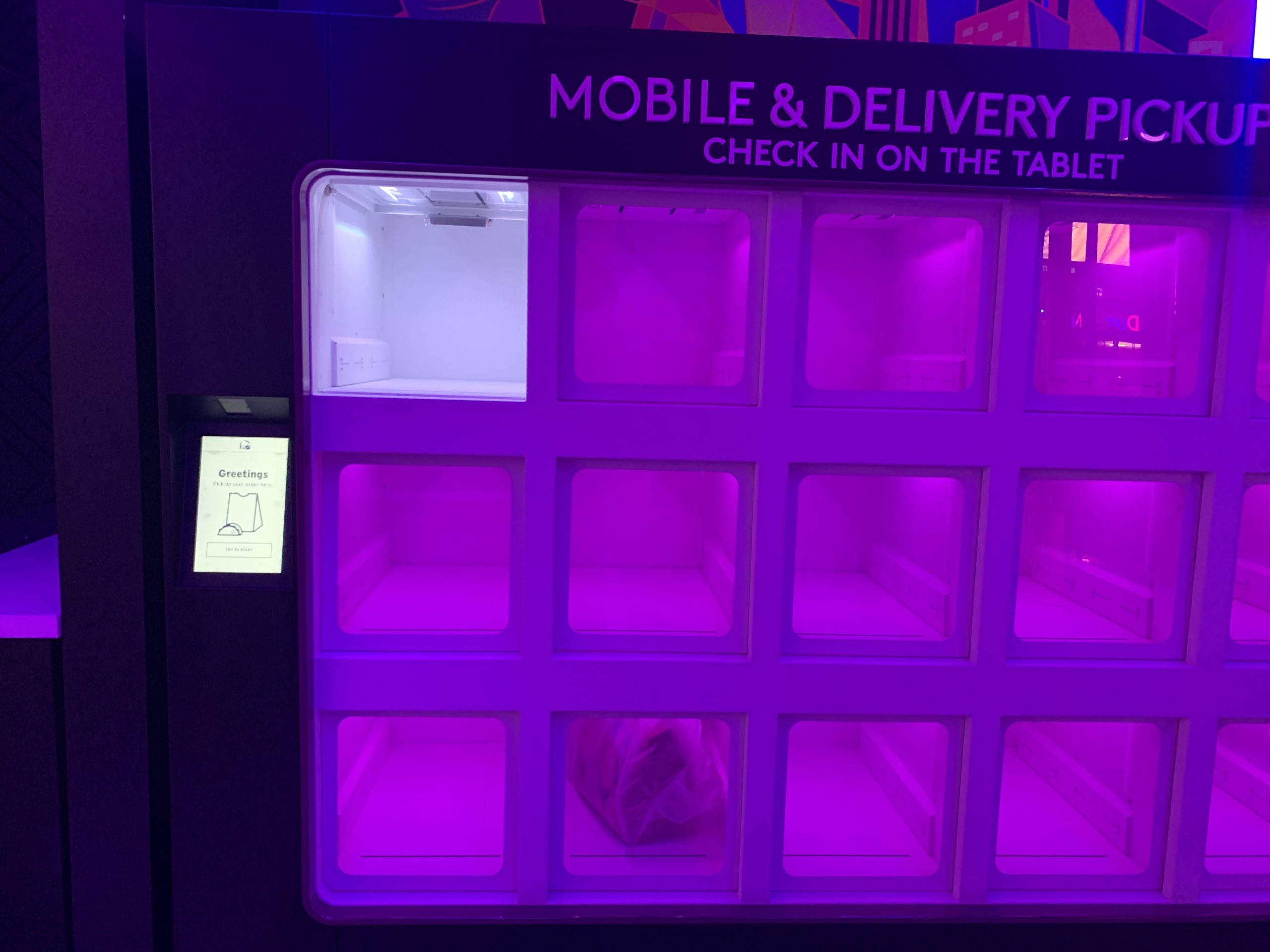 オープンキッチンの高級店舗でアルコール類を提供。オンラインで注文すると、ロッカーで受け取る仕組み。専用出入口を使うため、人との接触が最小限に抑えられる。レストラン内に並ぶキオスクで注文した場合は、奥のカウンターで受け取る。従業員70人態勢で生産ラインは4つで、通常店舗(35人・2ライン)の倍。