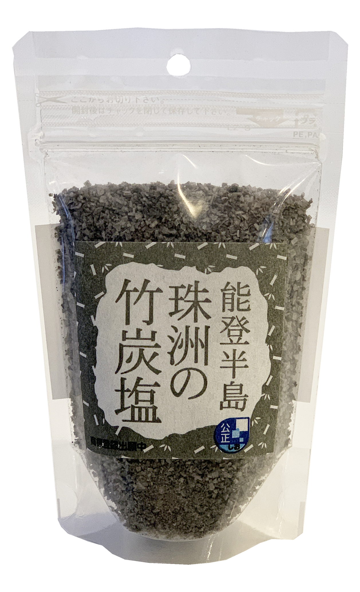 能登半島の三年物の青竹に塩を詰め込み、炭焼き職人が昔ながらの窯で三日三晩焼き上げ、ほぐした「黒い塩」。辛味が少なく焼肉・お刺身等におすすめ。