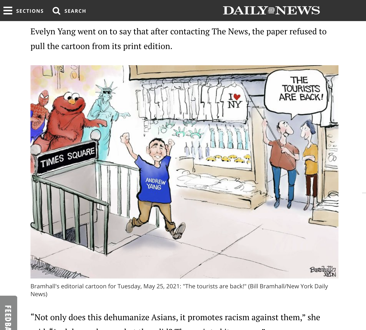 次期ニューヨーク市長選の有力候補、アンドリュー・ヤン氏(民主)は5月27日、ニューヨーク・デイリーニュース(ND)が掲載した自らをモデルとする漫画が「人種差別的だ」と非難した。CNNが同日、報じた。
