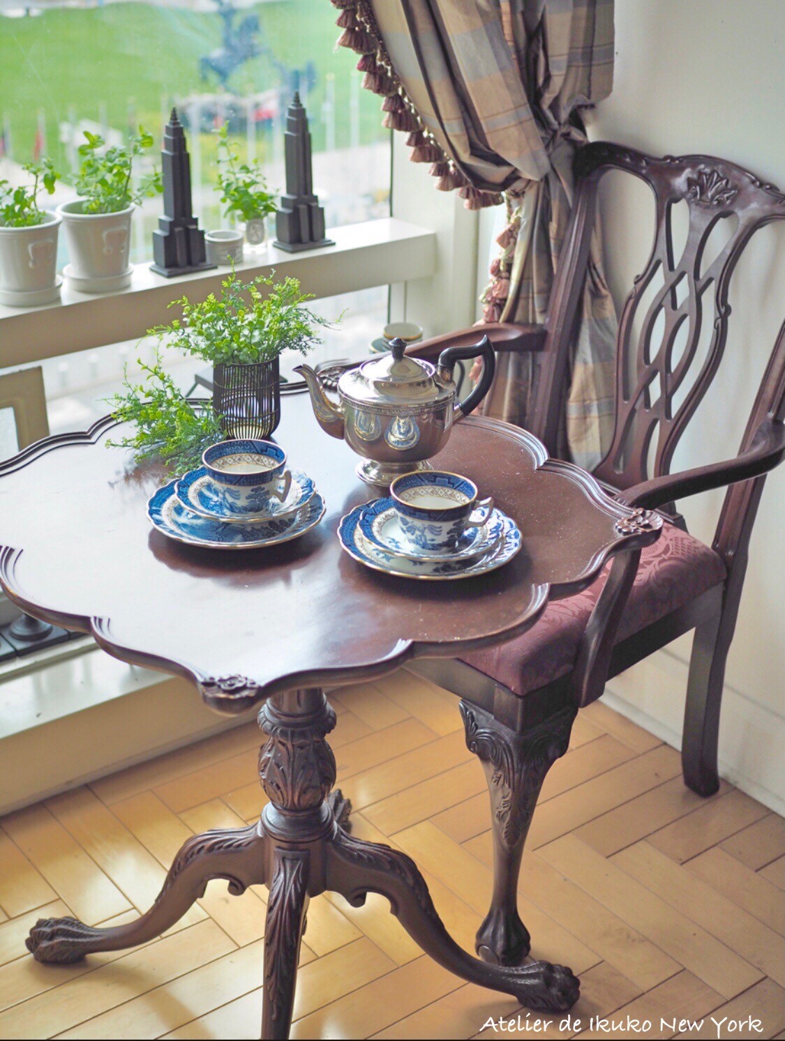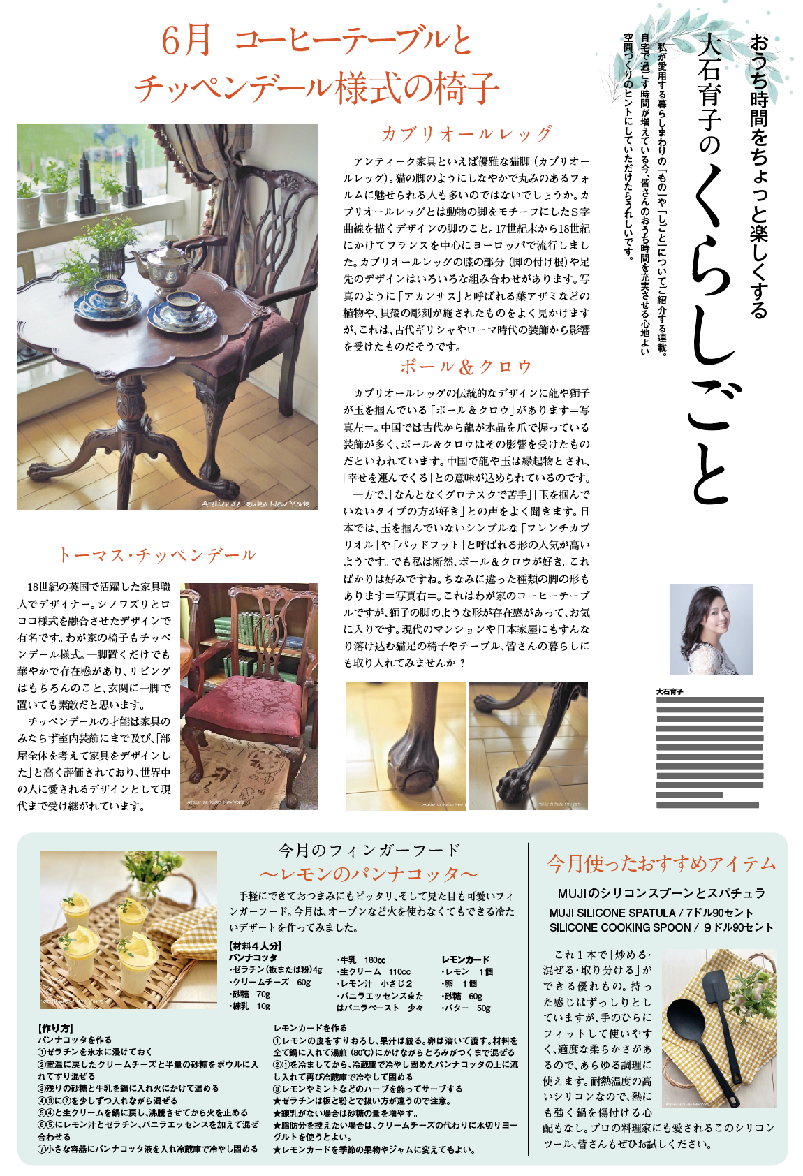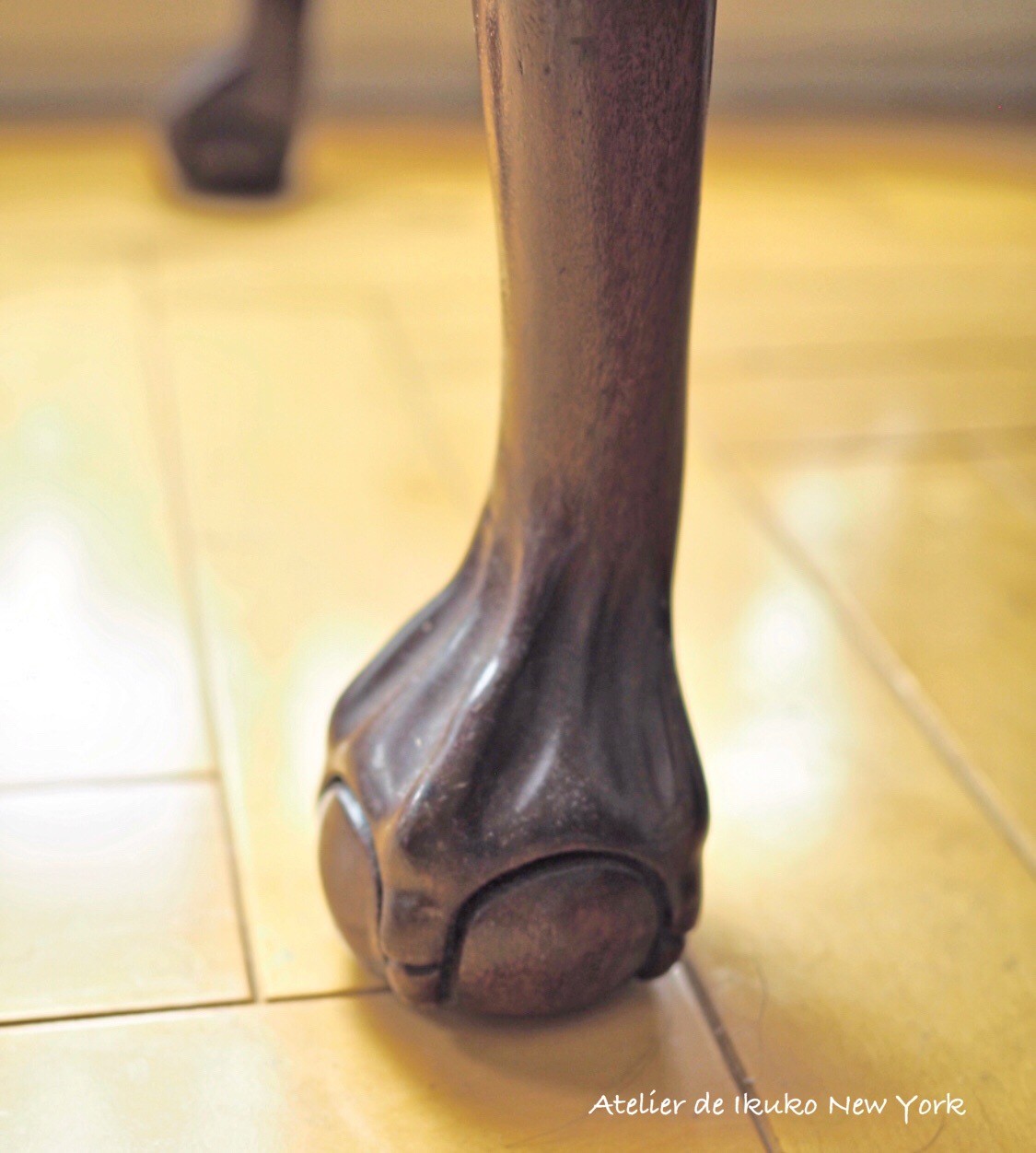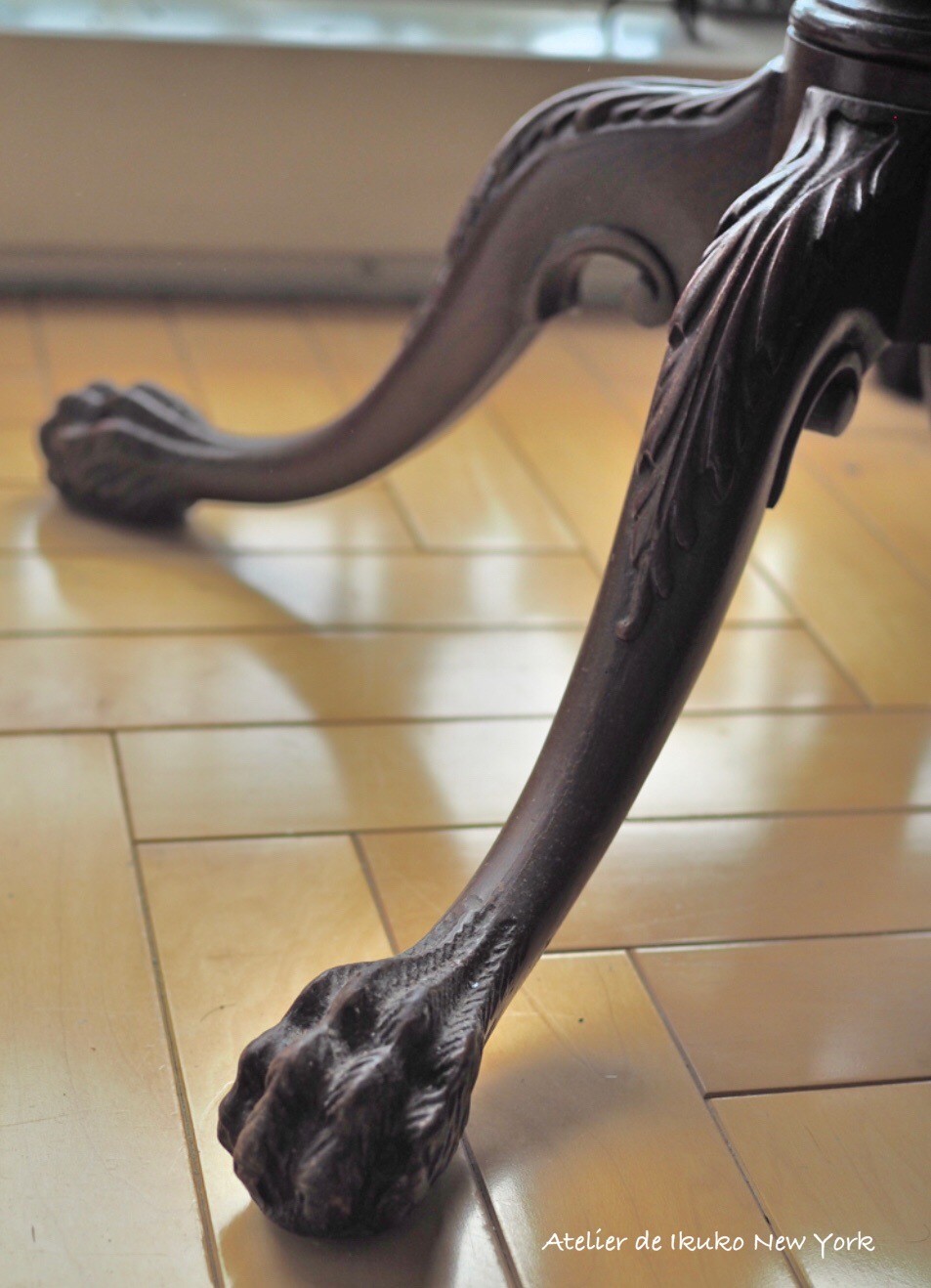 カブリオールレッグの伝統的なデザインに龍や獅子が玉を掴んでいる「ボール&クロウ」があります=写真左=。中国では古代から龍が水晶を爪で握っている装飾が多く、ボール&クロウはその影響を受けたものだといわれています。中国で龍や玉は縁起物とされ、「幸せを運んでくる」との意味が込められているのです。 一方で、「なんとなくグロテスクで苦手」「玉を掴んでいないタイプの方が好き」との声をよく聞きます。日本では、玉を掴んでいないシンプルな「フレンチカブリオル」や「パッドフット」と呼ばれる形の人気が高いようです。でも私は断然、ボール&クロウが好き。こればかりは好みですね。ちなみに違った種類の脚の形もあります=写真右=。これはわが家のコーヒーテーブルですが、獅子の脚のような形が存在感があって、お気に入りです。現代のマンションや日本家屋にもすんなり溶け込む猫足の椅子やテーブル、皆さんの暮らしにも取り入れてみませんか?