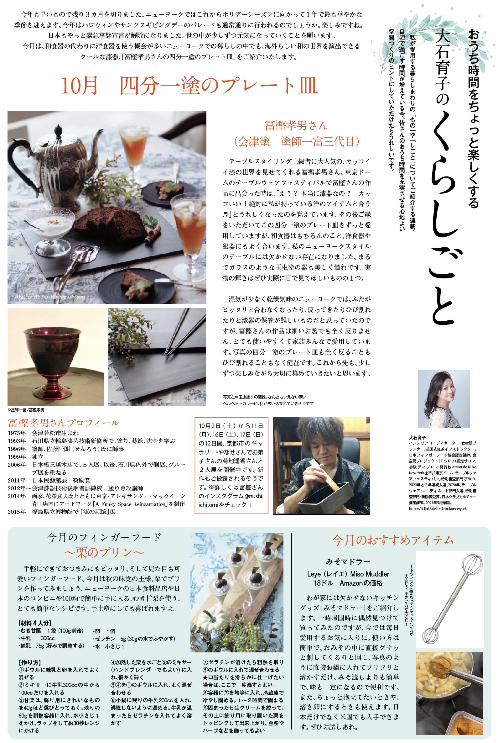 今年も早いもので残り3カ月を切りました。ニューヨークではこれからホリデーシーズンに向かって1年で最も華やかな季節を迎えます。今年はハロウィンやサンクスギビングデーのパレードも通常通りに行われるのでしょうか。楽しみですね。 日本もやっと緊急事態宣言が解除になりました。世の中が少しずつ元気になっていくことを願います。 今月は、和食器の代わりに洋食器を使う機会が多いニューヨークでの暮らしの中でも、海外らしい和の世界を演出できるクールな漆器、「冨樫孝男さんの四分一塗のプレート皿」をご紹介いたします。