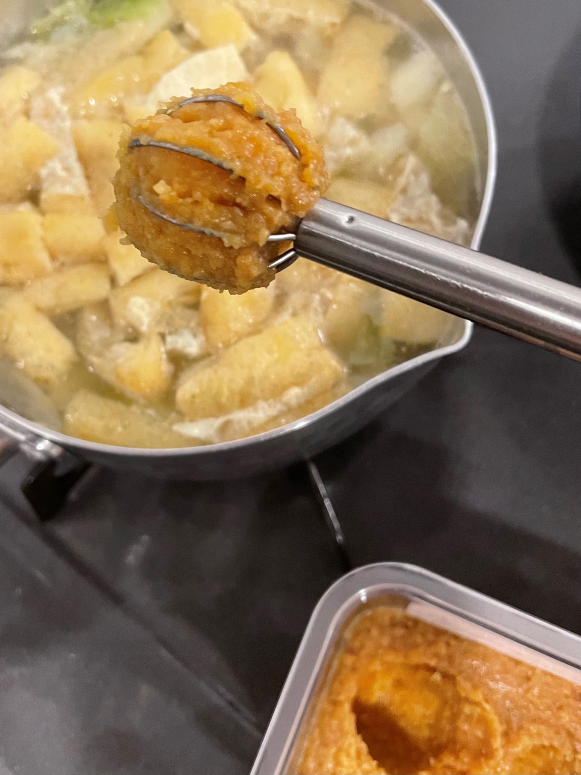 わが家には欠かせないキッチングッズ「みそマドラー」をご紹介します。一時帰国時に偶然見つけて買ってみたのですが、今では毎日愛用するお気に入りに。使い方は簡単で、おみその中に直接グサッと刺してくるりと回し、写真のように直接お鍋に入れてフリフリと溶かすだけ。みそ漉しよりも簡単で、味も一定になるので便利です。また、ちょっと泡立てたいときや、溶き卵にするときも使えます。日本だけでなく米国でも入手できます。ぜひお試しあれ。