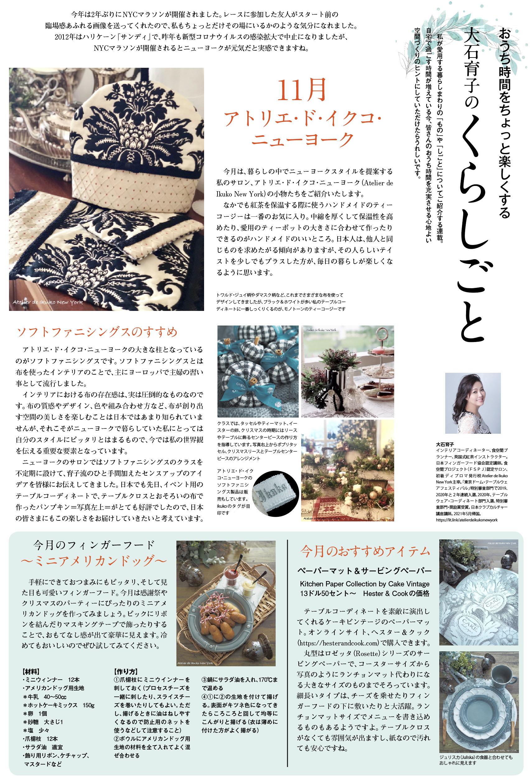 今月は、暮らしの中でニューヨークスタイルを提案する私のサロン、アトリエ・ド・イクコ・ニューヨーク(Atelier de Ikuko New York)の小物たちをご紹介いたします。 なかでも紅茶を保温する際に使うハンドメイドのティーコージーは一番のお気に入り。中綿を厚くして保温性を高めたり、愛用のティーポットの大きさに合わせて作ったりできるのがハンドメイドのいいところ。日本人は、他人と同じものを求めたがる傾向がありますが、その人らしいテイストを少しでもプラスした方が、毎日の暮らしが楽しくなるように思います。