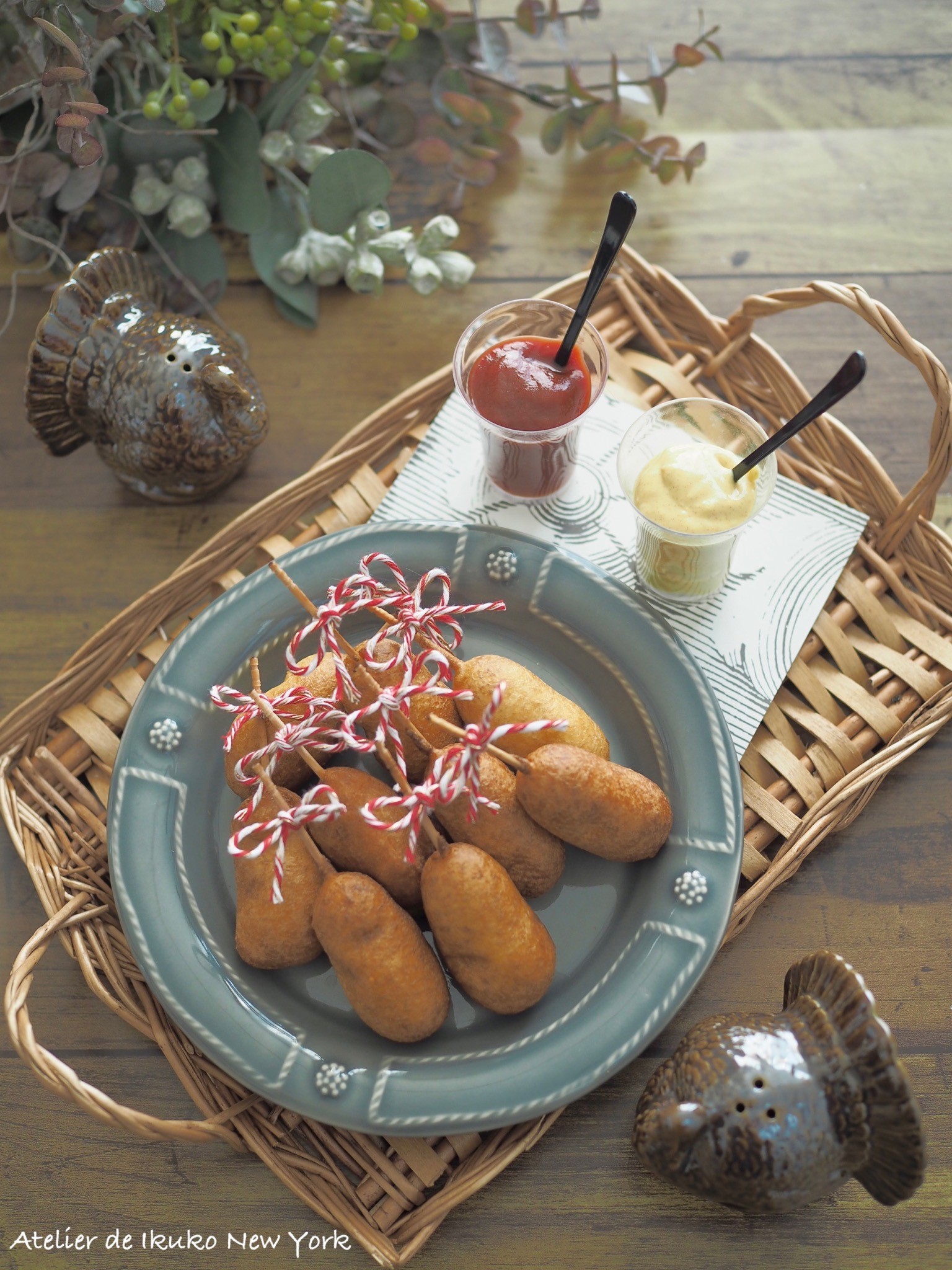 手軽にできておつまみにもピッタリ、そして見た目も可愛いフィンガーフード。今月は感謝祭やクリスマスのパーティーにぴったりのミニアメリカンドッグを作ってみましょう。ピックにリボンを結んだりマスキングテープで飾ったりすることで、おもてなし感が出て豪華に見えます。冷めてもおいしいのでぜひ試してみてください。