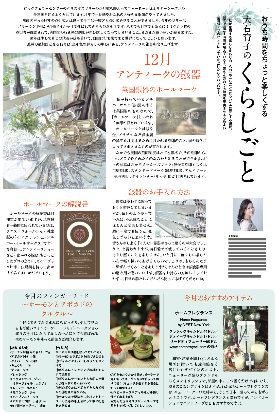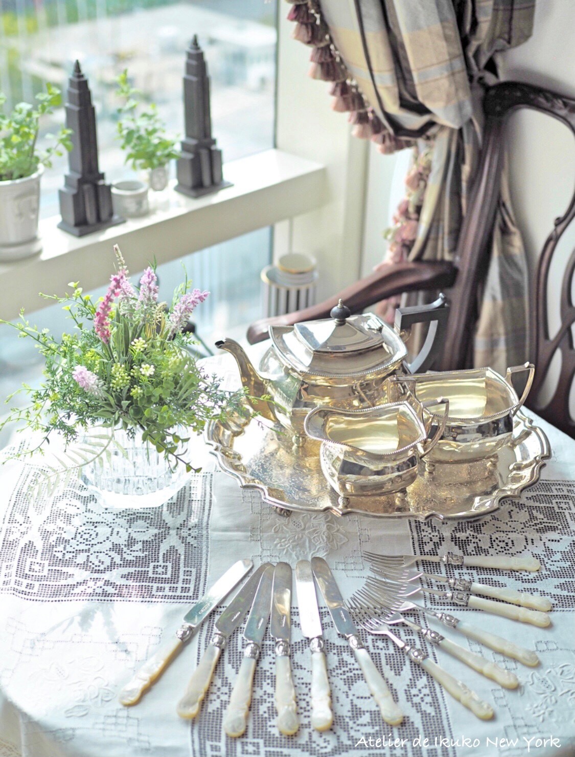 ロックフェラーセンターのクリスマスツリーの点灯式も終わってニューヨークはホリデーシーズンの 最高潮を迎えようとしています。1年で一番華やかな私の大好きな季節がやってきました。 無観客だった昨年の点灯式とは違って今年は一般客も点灯式を見ることができました。今年のツリーは メリーランド州から145マイルかけて運ばれてきたものだそうです。米国でも日本でも新たにオミクロン株の 感染者が確認されて、両国間の行き来の制限が再び厳しくなってしまいました。まだまだ長い闘いが続きますね。 来年は少しでもこの状況が落ち着いて、自由に行き来できる世界になってほしいと願います。 連載の最終回となる12月は、長年私の暮らしの中心にある、アンティークの銀器を取り上げます。