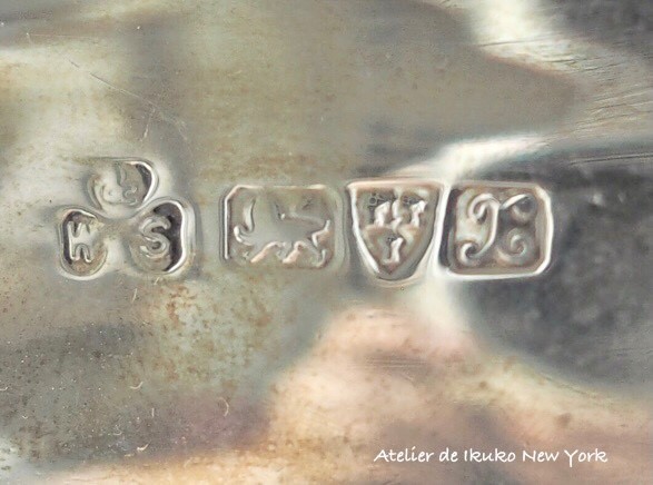 なかでも英国の刻印制度はとても厳格で、その刻印から、いつどこで作られたものなのかを知ることができます。右上の写真は左からメーカーズマーク(製作者刻印もしくは工房刻印)、スタンダードマーク(純度刻印)、アセイマーク(産地刻印)、デイトレター(年号刻印)が打刻されています。