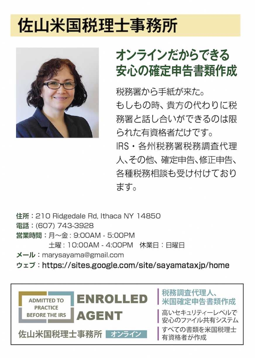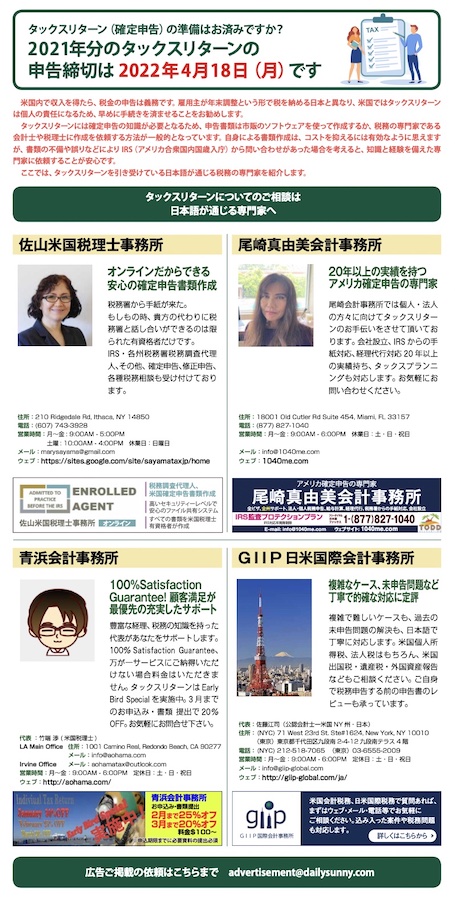 米国内で収入を得たら、税金の申告は義務です。雇用主が年末調整という形で税を納める日本と異なり、米国ではタックスリターンは個人の責任になるため、早めに手続きを済ませることをお勧めします。