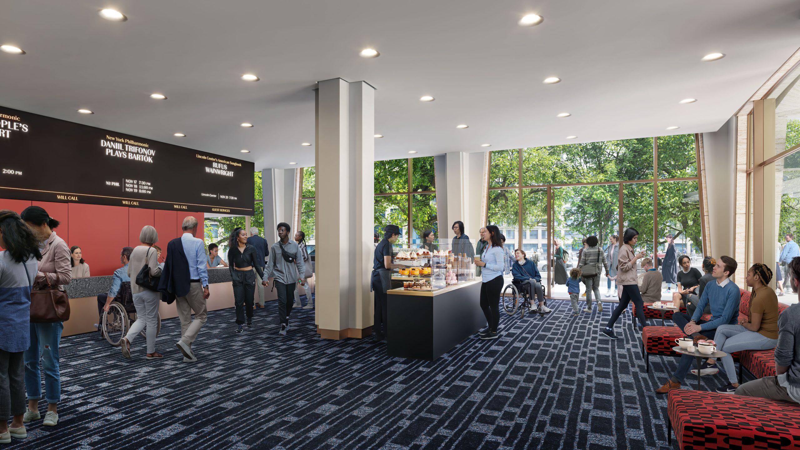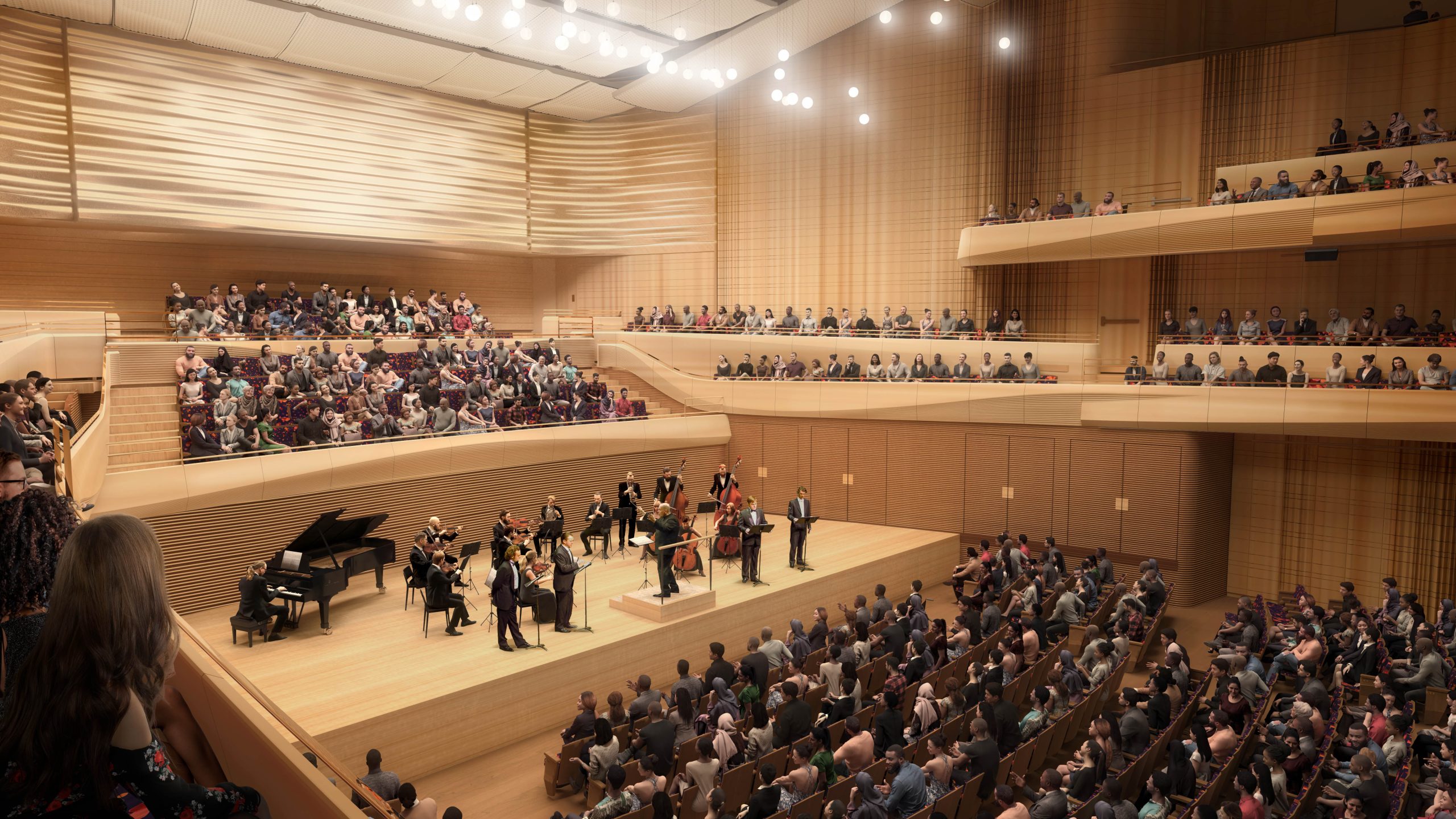 予算は5億5000万ドル。メインホールの音響効果を改善し、座席を2700席から2200席に減らした上でステージを囲む列を追加する。ステージを25フィート前にずらしたこともあり、観客との距離は30%短縮した。さらに、ロビーなどの公共スペースを拡張。ロビーの壁一面に50フィートのスクリーンを設置し、教育プログラムなどに利用するイベント会場も新設した。