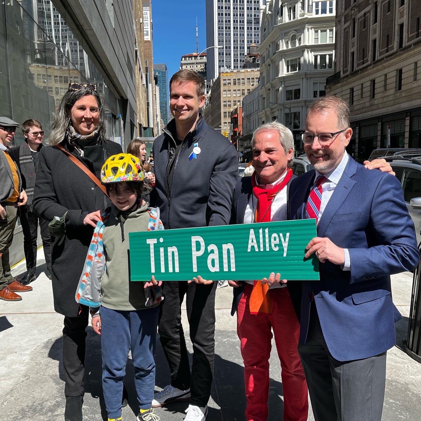 この日行なわれた記念式典で、マンハッタン区のレビン区長は「今でも口ずさむ曲は、ここから始まった」とコメント。黒人の歴史家、ジョン・レデック氏は「黒人の歌手や作詞家が初めて名を成したのもここ」と指摘した。地元振興を目指す「ティン・パン・アレー・米国ポピュラー音楽・プロジェクト」責任者、ジョージ・カルデラロ氏は「ここを世界的に有名にしたい」と抱負を語った。