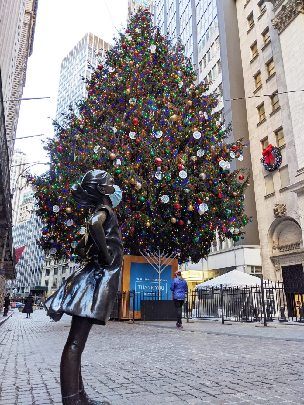 マンハッタン区の金融街の一角、ニューヨーク証券取引所に向き合うように立つ彫刻「Fearless Girl」(恐れを知らぬ少女)像。2017年、金融街の象徴である雄牛のブロンズ像「チャージング・ブル」に正面から対峙するように設置された後、現在の場所に移設された。腰に手を当てて胸を張る身長127cm の女の子は、企業における女性管理職の比率向上などのメッセージを国内外に広く伝えている。