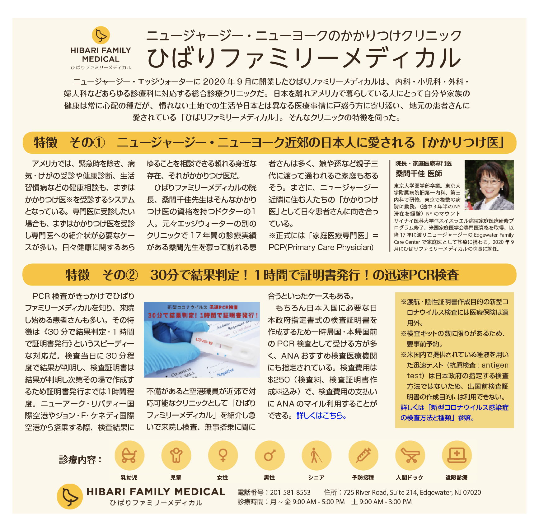 PCR検査がきっかけでひばりファミリーメディカルを知り、来院し始める患者さんも多い。その特徴は《30分で結果判定・1時間で証明書発行》というスピーディーな対応だ。検査当日に30分程度で結果が判明し、検査証明書は結果が判明し次第その場で作成するため証明書発行までは1時間程度。ニューアーク・リバティー国際空港やジョン・F・ケネディ国際空港から搭乗する際、検査結果に不備があると空港職員が近郊で対応可能なクリニックとして「ひばりファミリーメディカル」を紹介し急いで来院し検査、無事搭乗に間に合うといったケースもある。  もちろん日本入国に必要な日本政府指定書式の検査証明書を作成するため一時帰国・本帰国前のPCR検査として受ける方が多く、ANAおすすめ検査医療機関にも指定されている。検査費用は$250(検査料、検査証明書作成料込み)で、検査費用の支払いにANAのマイル利用することができる。詳しくはこちら。